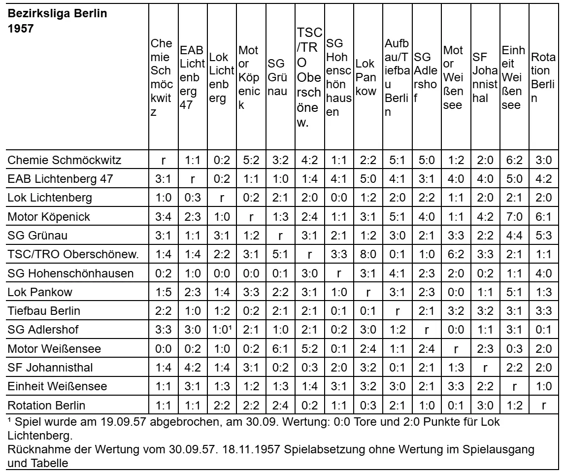 ( 2 ) - Platzierung nach der Saison 1956; ( LA ) - Ligaabsteiger; ( M ) - Meister; ( P ) - Pokalsieger; ( N ) - Neuling Absteiger aus der 2.DDR-Liga: keiner Bezirksmeister: Chemie Schmöckwitz Aufsteiger zur 2.DDR-Liga: Chemie Schmöckwitz, EAB Lichtenberg 47, Lok Lichtenberg Absteiger zur Bezirksklasse: Einheit Weißensee, Rotation Berlin Aufsteiger aus der Bezirksklasse: Empor Friedrichstadt, Einheit Treptow, SG Köpenick Bezirkspokalfinale: SG Adlershof - SG Nordring 1949 Berlin 8:4 Änderungen Vereine: 1957: Fusion von BSG Lok Bau-Union Pankow zur BSG Lokomotive Pankow 29.03.1957: Neugründung der BSG Tiefbau Berlin aus dem ehemaligen SC Aufbau Berlin 14.09.1957: Umbenennung der BSG Motor Oberschöneweide in TSC/TRO Oberschöneweide 1957: Fusion von BSG Motor Wendenschloß mit BSG Motor Köpenick (gegr. 1950) zur BSG Motor Köpenick | |||||||||||