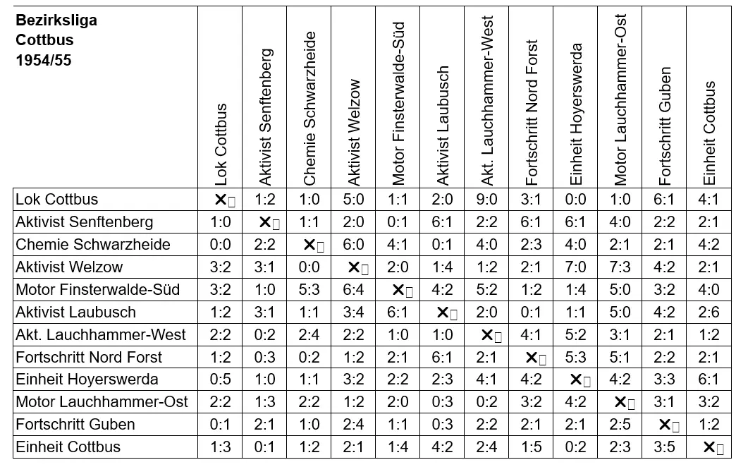 ( 2 ) - Platzierung nach der Saison 1953/54; ( LA ) - Ligaabsteiger; ( M ) - Meister; ( P ) - Pokalsieger; ( N ) - Neuling Absteiger aus der DS-Liga: Chemie Weißwasser Bezirksmeister: Lok Cottbus Aufsteiger zur 2.DS-Liga : Lok Cottbus Absteiger zur Bezirksklasse: Einheit Cottbus Aufsteiger aus der Bezirksklasse: Fortschritt Cottbus, Lok Falkenberg, Einheit Spremberg, Empor Mitte Cottbus Die Bezirksliga Cottbus spielt in der Übergangsrunde 1955 mit 15 Mannschaften Umbenennung der BSG Fortschritt Forst in BSG Fortschritt Nord Forst | |||||||||||