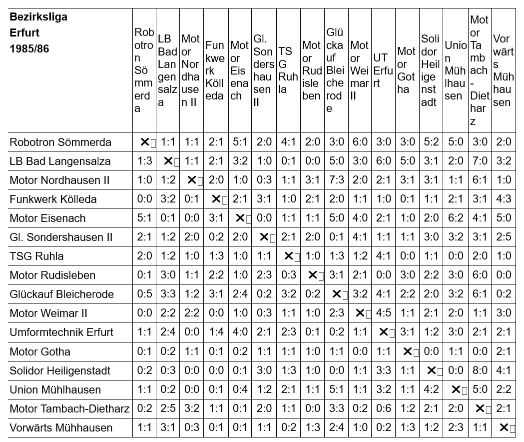 | ✔ | Bezirksliga Erfurt 1985/86 | Sp | S | U | N | Tore | Punkte | ||||