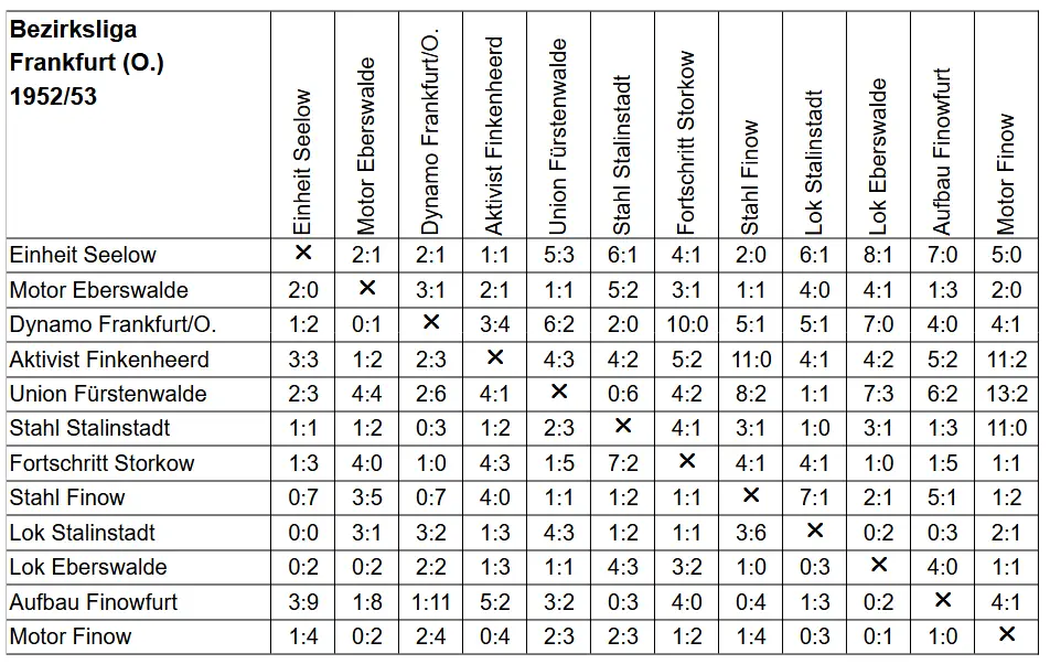 Auf dieser Seite sind die Abschlusstabellen der Bezirksliga Frankfurt (Oder) zur Saison 1952/53 mit beteiligten Mannschaften und statistischen Angaben dokumentiert. Historische Daten und ergänzende Informationen werden fortlaufend überprüft und erweitert.