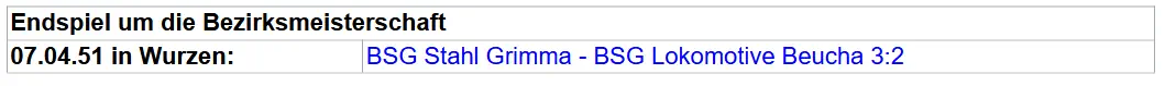 | ✔ | Bezirksklasse Nordwestsachsen Staffel 1 1950/51 | Sp | S | U | N | Tore | Diff | Pkt. | |||