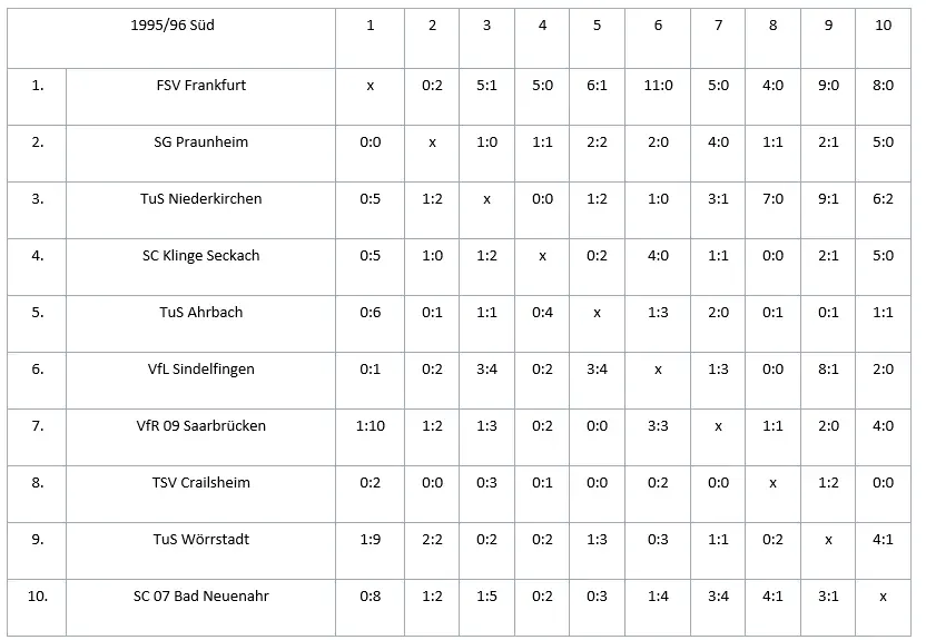 | Frauen Bundesliga Süd 1995/1996 | Sp | S | U | N | Tore | Diff | Pkt | ||
