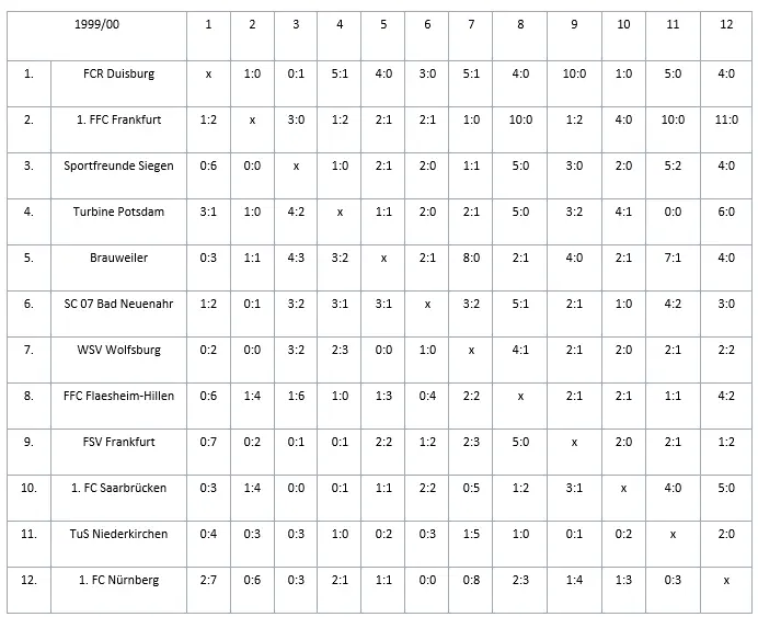 | Frauen Bundesliga 1999/2000 | Sp | S | U | N | Tore | Diff | Pkt | ||
