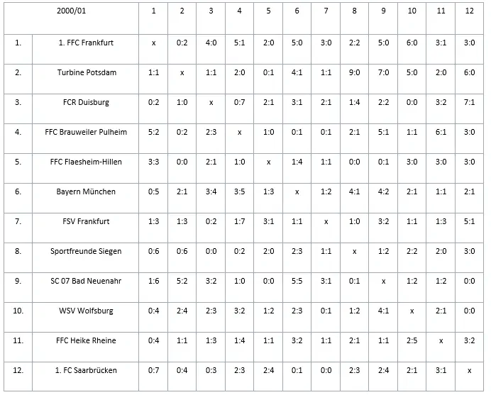 | Frauen Bundesliga 2000/2001 | Sp | S | U | N | Tore | Diff | Pkt | ||