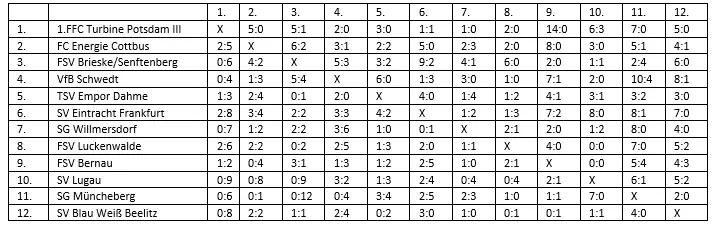 | 1 | 1.FFC Turbine Potsdam III | 22 | 21 | 1 | 0 | 115:13 | +102 | 64 | |