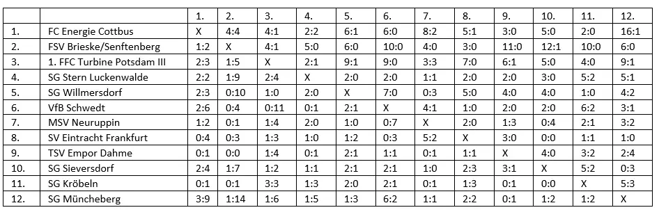 | 2 | FSV Brieske/Senftenberg | 22 | 19 | 2 | 1 | 130:12 | +118 | 59 | |