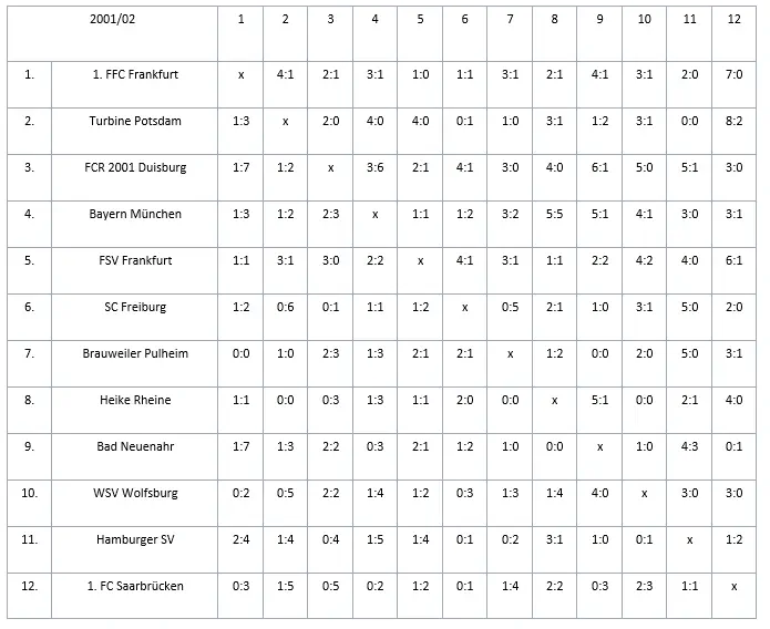 | Frauen Bundesliga 2001/2002 | Sp | S | U | N | Tore | Diff | Pkt | ||