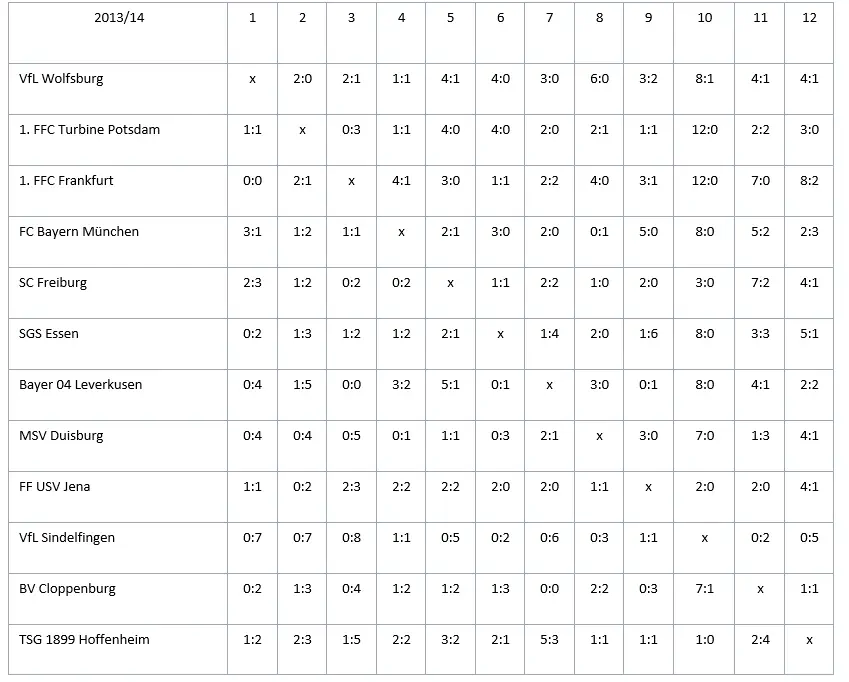 | Frauen Bundesliga 2013/2014 | Sp | S | U | N | Tore | Diff | Pkt | ||