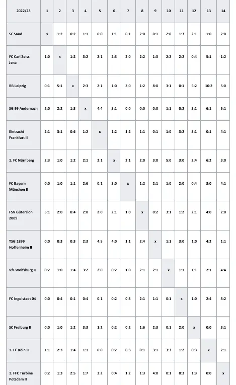 | Frauen 2.Bundesliga 2022/2023 | Sp | S | U | N | Tore | Diff | Pkt | ||