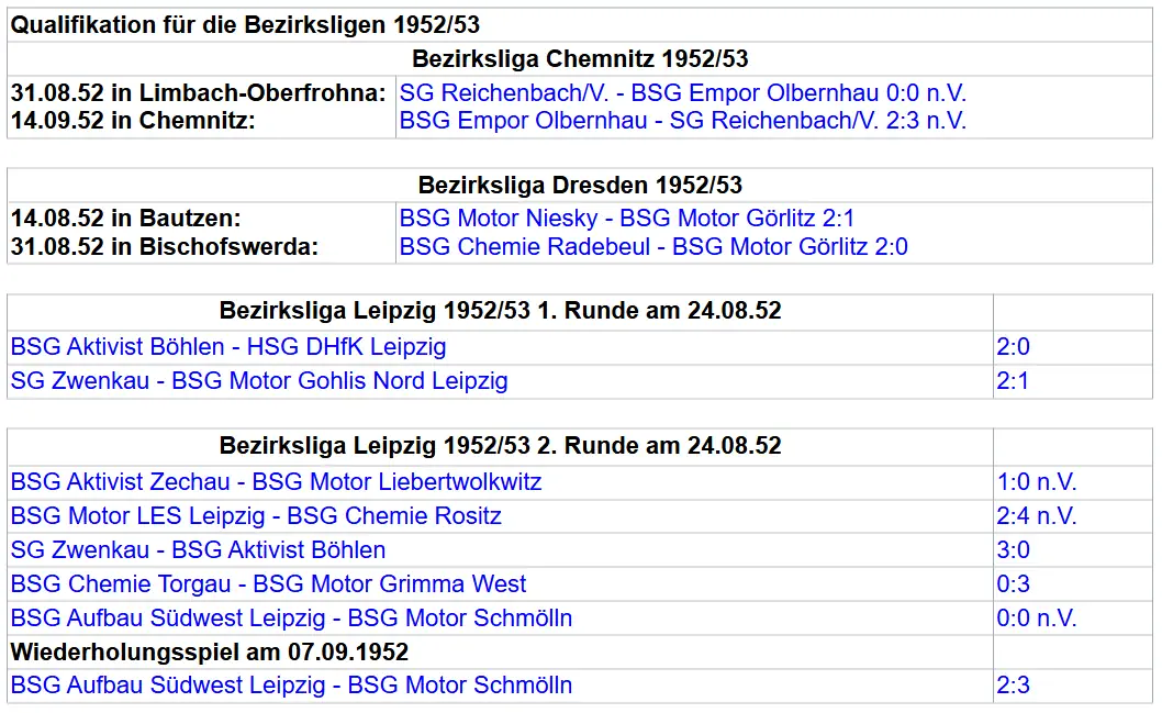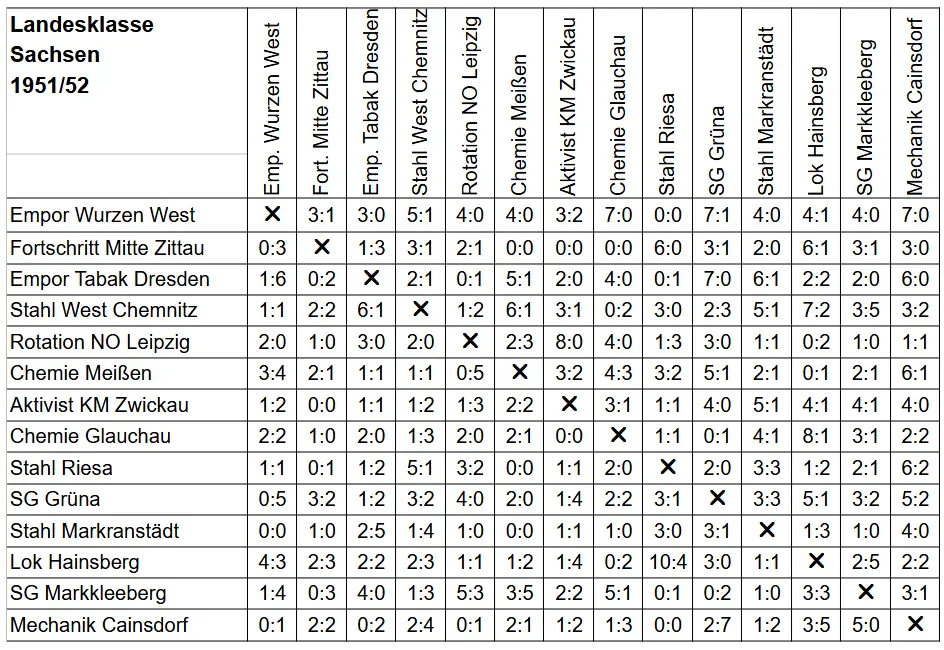 | ✔ | Landesklasse Sachsen 1951/52 | Sp | S | U | N | Tore | Diff | Pkt. | |||