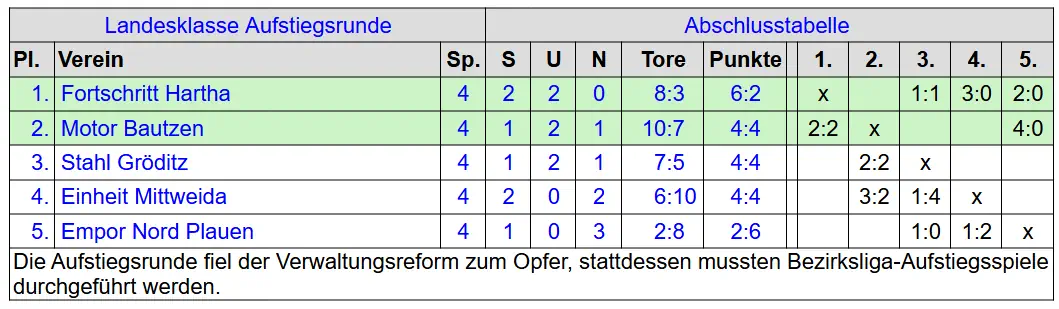 | 9 | Stahl Riesa ( 6 ) | 26 | 9 | 8 | 9 | 41:47 | 26:26 | ||||